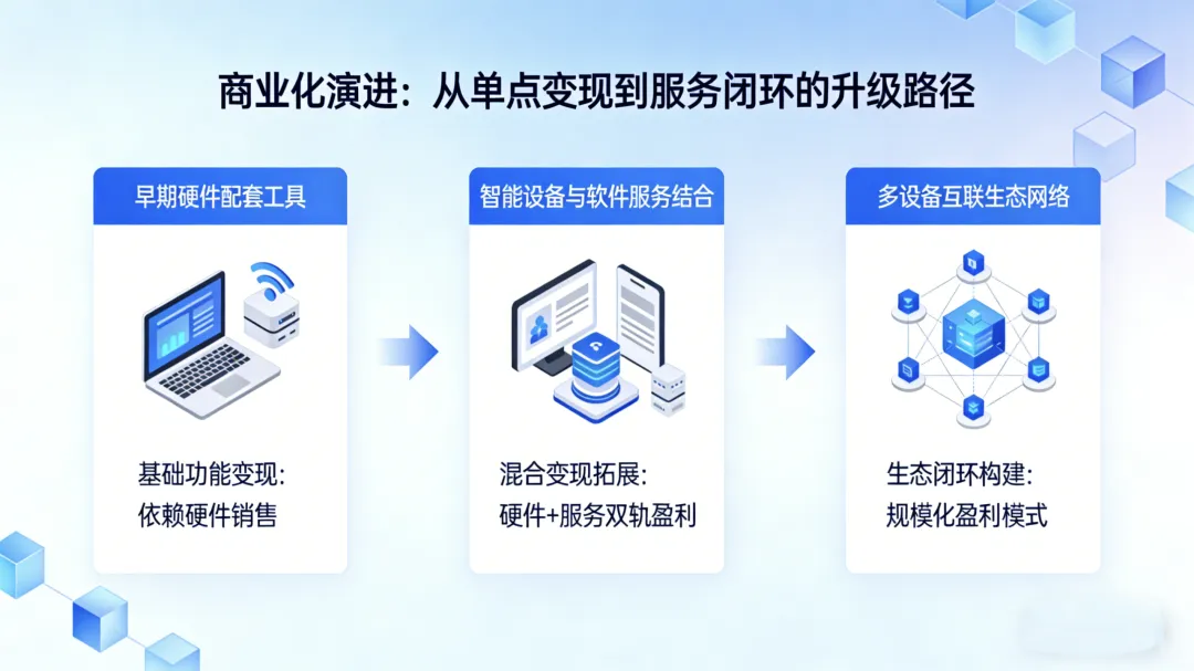 早期的智能设备应用多作为硬件产品的配套工具存在,商业化模式单一,主要依赖硬件销售。随着智能家居设备的普及和用户需求的多元化,商业化模式正逐步转向“混合变现+生态闭环” 的规模化盈利模式。