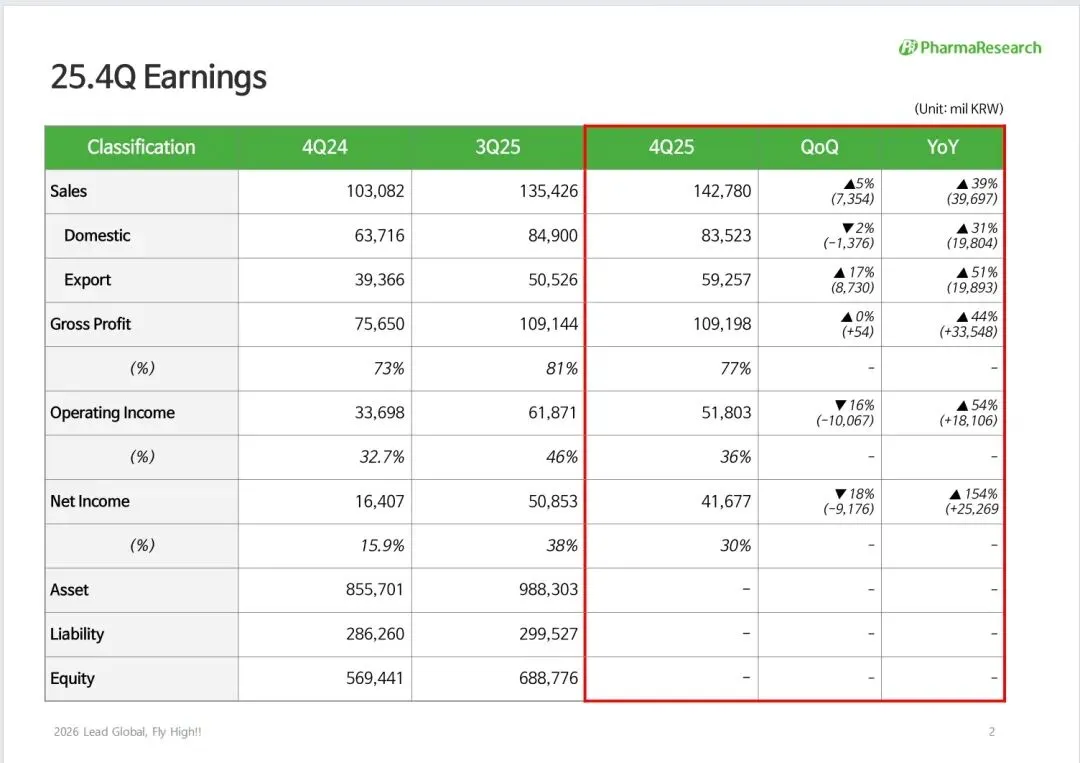 2026年2月5日,丽珠兰母公司——Pharma Research近日发布2025年临时业绩通告。公司宣布2025年合并基准销售额达5357亿韩元,营业利润2142亿韩元,营业利润率40%。这一数字较上年销售额增长53%,营业利润增长70%。