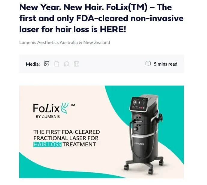 2026年2月7日,Lumenis宣布,其旗下FoLix™脱发治疗设备正式登陆澳大利亚市场。FoLix™是目前首款且唯一获得美国FDA批准的点阵非剥脱性激光脱发治疗设备,此前已于2024年6月在美国上市。