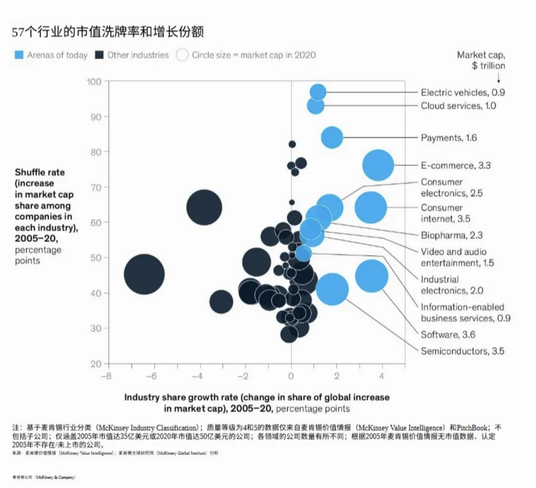 报告发现,过去15年表现最突出的12个领域(如电动车、云服务、生物制药、半导体、支付、视频娱乐等),在2020年已占据全球经济利润的一半,并诞生了大量市值超500亿美元的巨头企业。