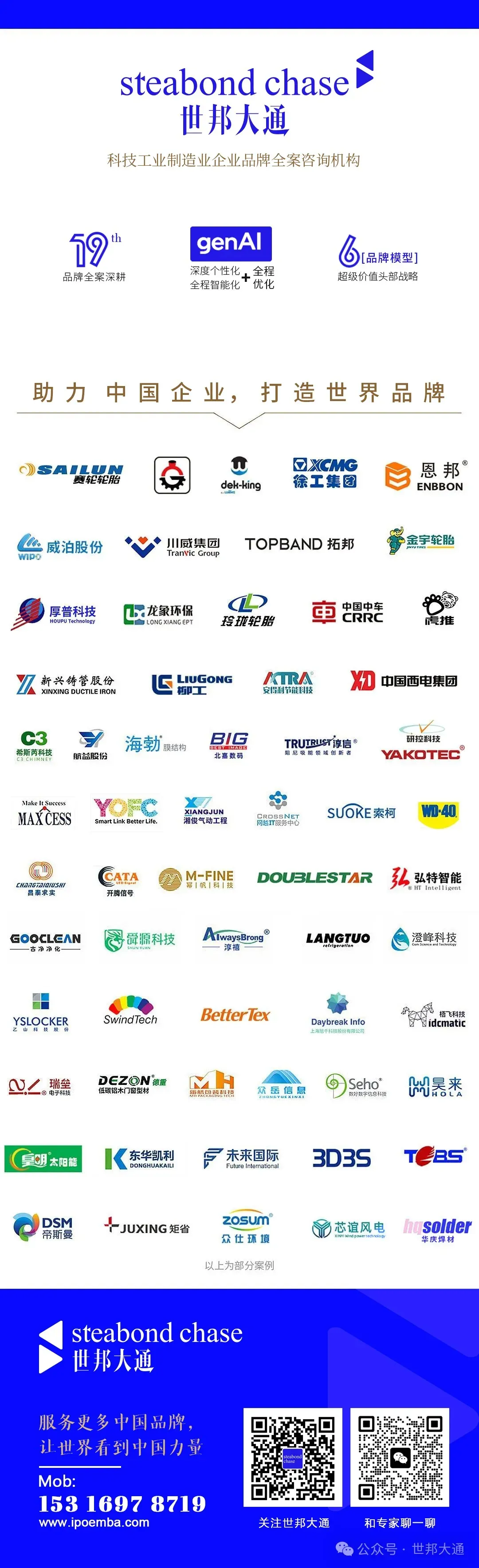 世邦大通咨询始终围绕解决B2B企业品牌价值塑造及营收增长的核心问题,深耕策划行业20余年,专家团队为国家名片提名人和终审评委、国家工信部专精特新评审专家、上海市政府品牌专家委员单位,助力企业成就细分行业龙头品牌,专注为B2B企业提供品牌建设及营销驱动增长,覆盖了初创型企业到行业头部不同阶段类型,为企业制定品牌增长战略,并用创意引爆战略。