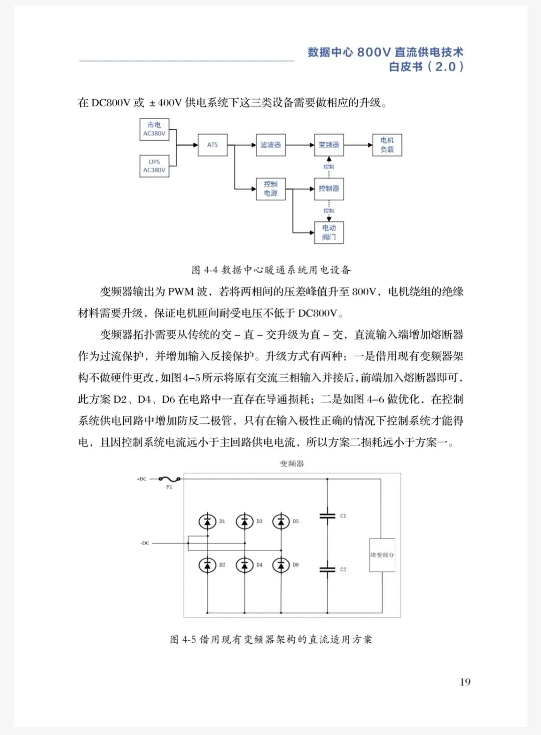 数据中心的空调、风机等暖通设备,核心是电机、变频器和低压控制单元。在800V直流系统下,仅需对设备进行针对性升级: