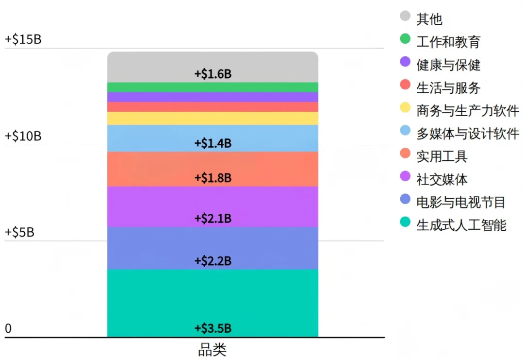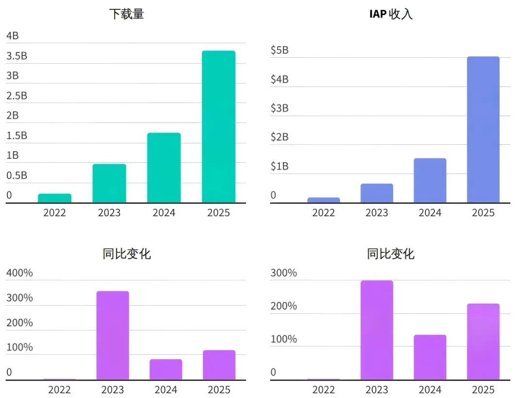 2025年,生成式AI应用在全球被下载了38亿次,比上一年多了一倍;内购收入超过50亿美元,差不多是之前的三倍。