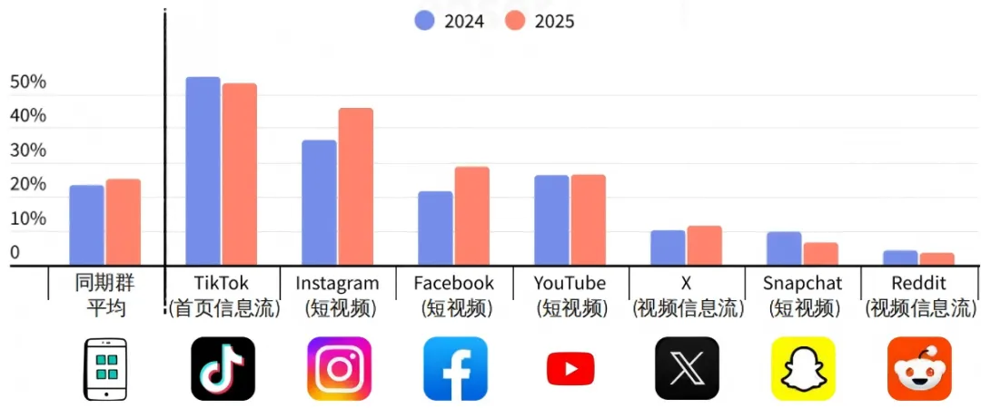 社交媒体类应用的总使用时长,占了所有移动应用总时长的60%以上,TikTok、YouTube、Instagram这些平台,还是用户花时间最多的地方。