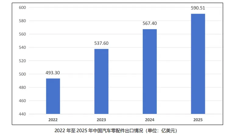 2022 年至 2025 年,中国汽车零配件出口总额呈稳步上升趋势,从 2022 年的 493.3 亿美元,上升至 2025 年的 590.51 亿美元。具体参见下图: