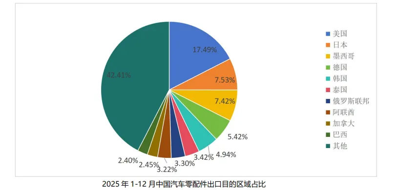 2025 年 1-12 月,中国汽车零配件主要出口至美国、日本、墨西哥等地区,三地区合计占出口总量的32.44%;出口增量比较大的是越南、德国等国家。具体参见下图: