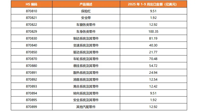 根据海关统计口径,汽车零配件(HS:8708)项下包含 15 个六位 HS 编码。六位 HS 编码对应产品描述及 2025 年 1-12 月出口统计情况列示如下: