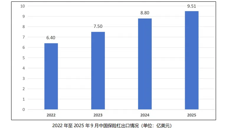 2022 年至 2025 年,中国保险杠出口总额呈稳步上升趋势,从 2022 年的 6.4 亿美元,上升至 2025年的 9.51 亿美元。具体参见下图: