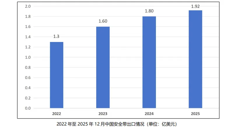 2022 年至 2025 年 12 月,中国安全带出口总额呈上升趋势,从 2022 年的 1.3 亿美元,上升至 2025年的 1.92 亿美元。具体参见下图: