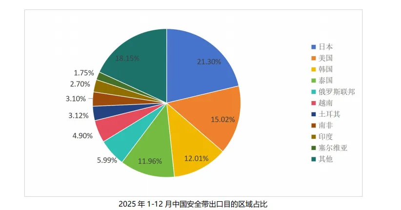 2025 年 1-12 月,中国安全带主要出口至日本、美国、韩国等地区,三地区合计占出口总量的 48.33%;出口增量比较大的是韩国等国家。具体参见下图:
