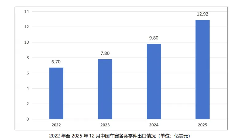 2022 年至 2025 年 12 月,中国车窗各类零件出口总额呈稳步上升趋势,从 2022 年的 6.7 亿美元,上升至 2025 年的 12.92 亿美元。具体参见下图: