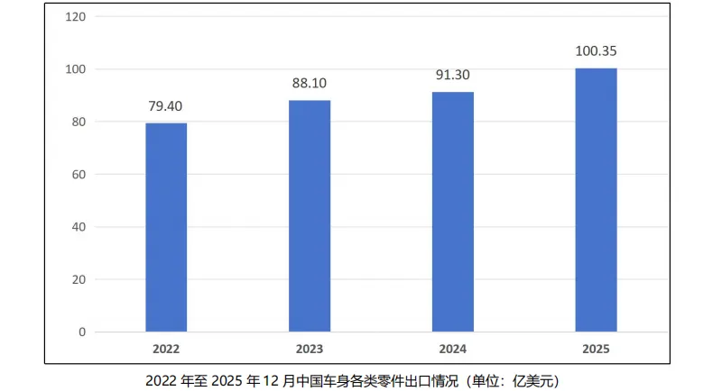 2022 年至 2025 年 12 月,中国车身各类零件出口总额呈上升趋势,从 2022 年的 79.4 亿美元,上升至 2025 年的 100.35 亿美元。具体参见下图: