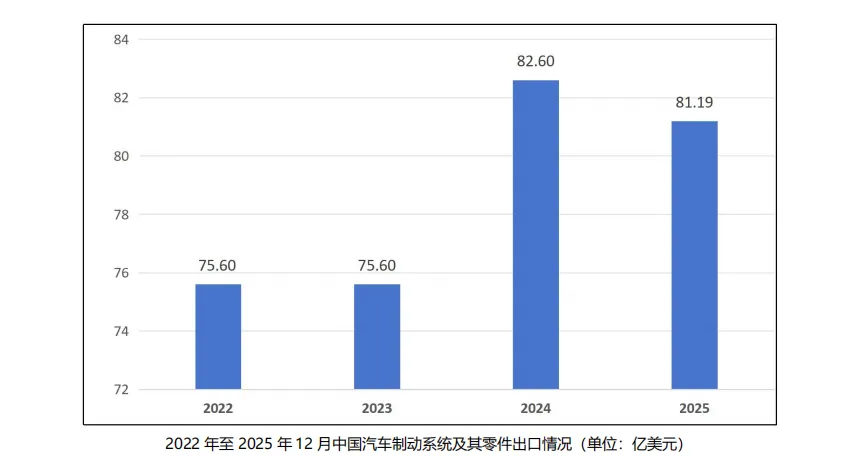 2022 年至 2025 年 12 月,中国汽车制动系统及其零件出口总额呈上升趋势,从 2022 年的 75.6 亿美元,上升至 2025 年的 81.19 亿美元。具体参见下图