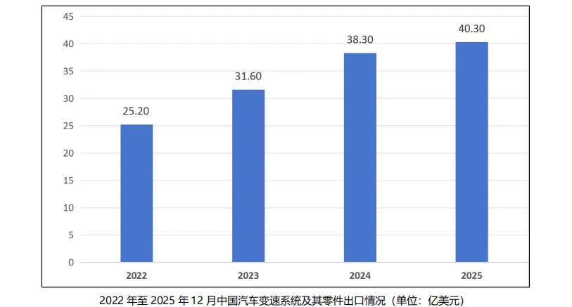 2022 年至 2025 年 12 月,中国汽车变速系统及其零件出口总额呈上升趋势,从 2022 年的 25.2 亿美元,上升至 2024 年的 38.3 亿美元。具体参见下图: