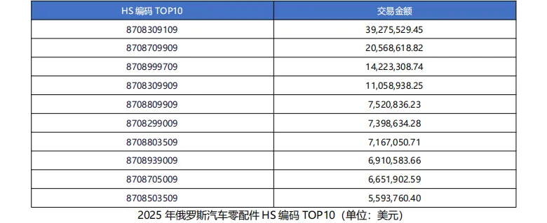 根据俄罗斯海关数据,2025 年,俄罗斯汽车零配件进口涉及 1000 家采购商,2000 家供应商,交易次数达 3.34 万次,交易金额约 6 亿美元。HS 编码 TOP10 及交易金额列示如下: