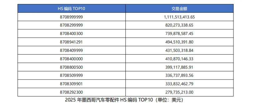 根据墨西哥海关数据,2025 年,墨西哥汽车零配件进口涉及 2000 家采购商,5000 家供应商,交易次数达 97.92 万次,交易金额约 1.093 百亿美元。HS 编码 TOP10 及交易金额列示如下:
