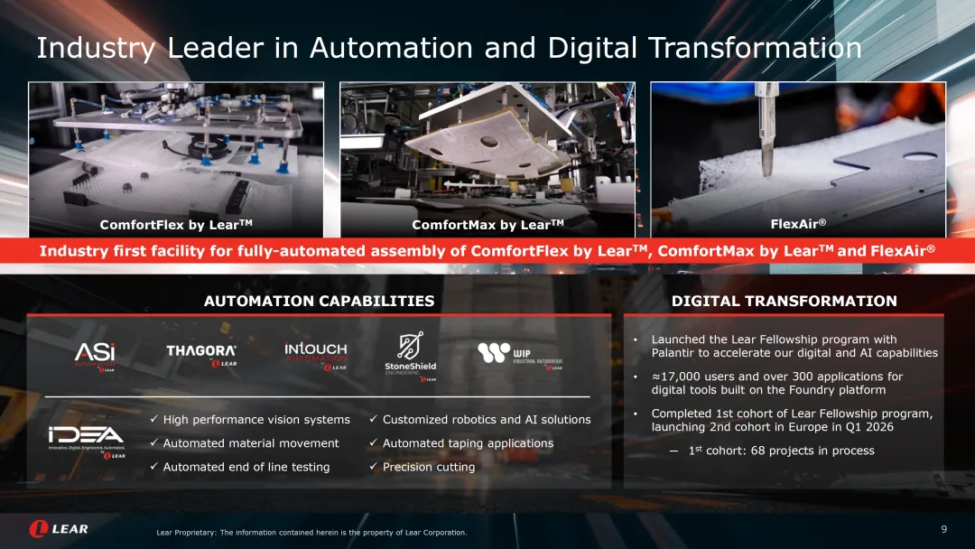 李尔实现创纪录的运营表现!对此,李尔公司首席执行官兼总裁Ray Scott表示:感谢大家在过去一年的奉献与坚韧。面对快速演变的汽车行业,团队在2025年展现了卓越的专注和执行力,为新一年奠定坚实基础。第四季度,座椅与电子电气系统业务均实现稳健运营和财务表现,以严谨执行和强劲现金创造力圆满收官。团队在充满变化的环境中表现卓越,充分展现李尔的核心优势:战略执行、全球规模优势、快速解决问题及交付行业最高质量产品。