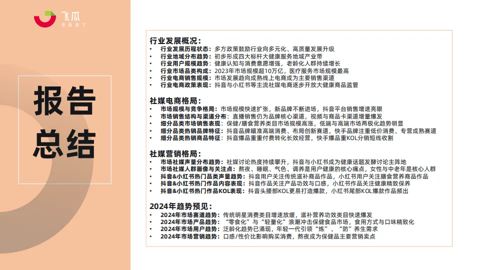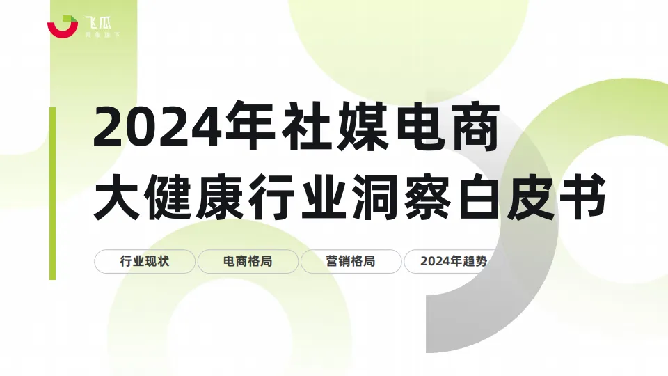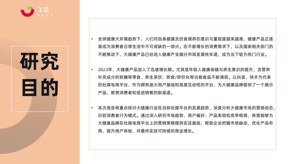 • 本次报告将重点探讨大健康行业在当前社媒平台的发展趋势,深度分析大健康市场的营销动态,识别消费者行为模式。通过深入研究市场趋势、用户偏好、产品表现和竞争格局,希望能够为大健康品牌在社媒电商平台上的营销策略提供实证基础,帮助企业把握市场脉动,优化产品布局,提升用户体验,并最终实现可持续的商业增长。