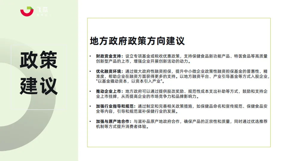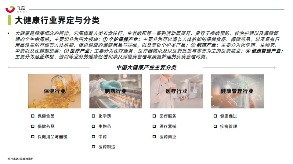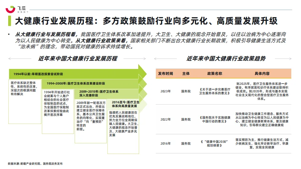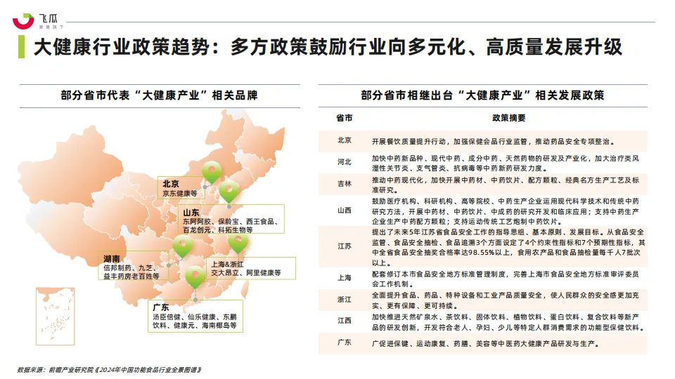 • 全球健康大环境趋势下,人们对自身健康及饮食调养的意识与重视度越来越高,健康产品正逐渐成为消费者日常生活中不可或缺的一部分。在不断增长的消费需求下,以及国家相关部门的不断推动下,大健康产品已经进入健康产业细分市场发展快车道,成为当下较为热门行业。