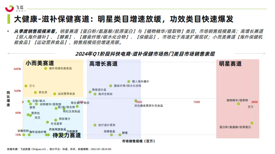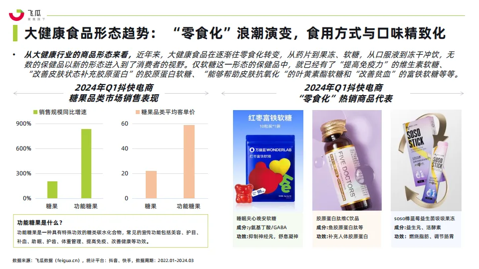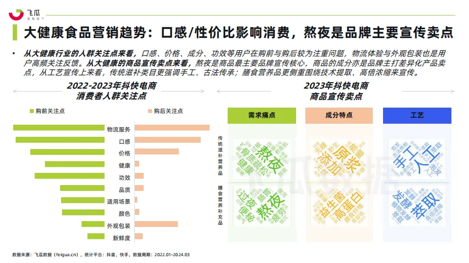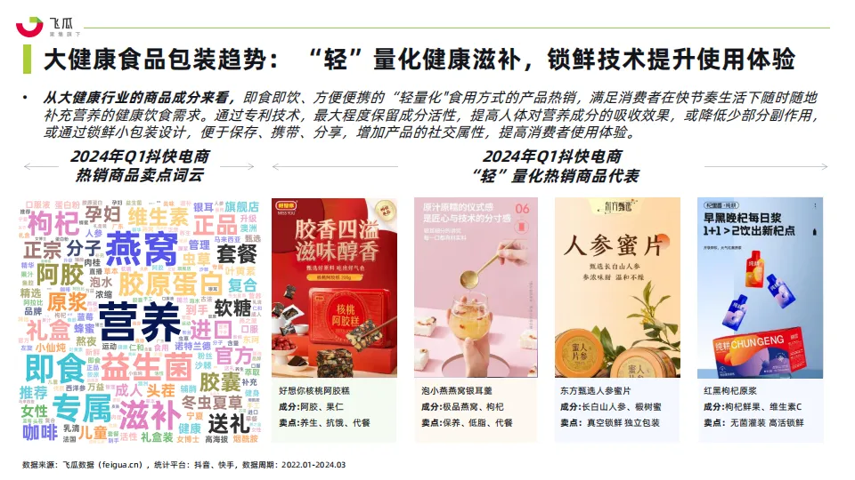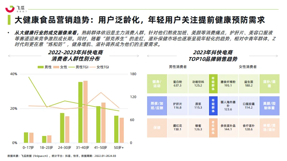 • 2023年,大健康产品进入了迅速增长期。尤其是年轻人健康保健与养生意识的提升,含营养补充成分的软糖等零食、养生茶饮、即食/即饮化等功能食品不断涌现。以抖音、快手为代表的社媒电商平台,作为拥有庞大用户基础和高度互动性的平台,为大健康品牌提供了一个展示产品、教育消费者和促进销售的新渠道。