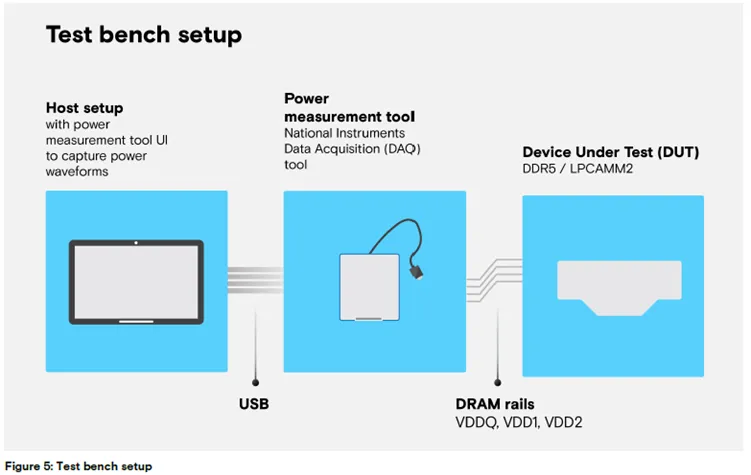 核心组件:搭载功耗测量工具的主机、UL 功耗波形采集工具、美国国家仪器(NI)数据采集工具、被测设备(DDR5/LPCAMM2)、USB、DRAM 供电(VDDQ、VDD1、VDD2)