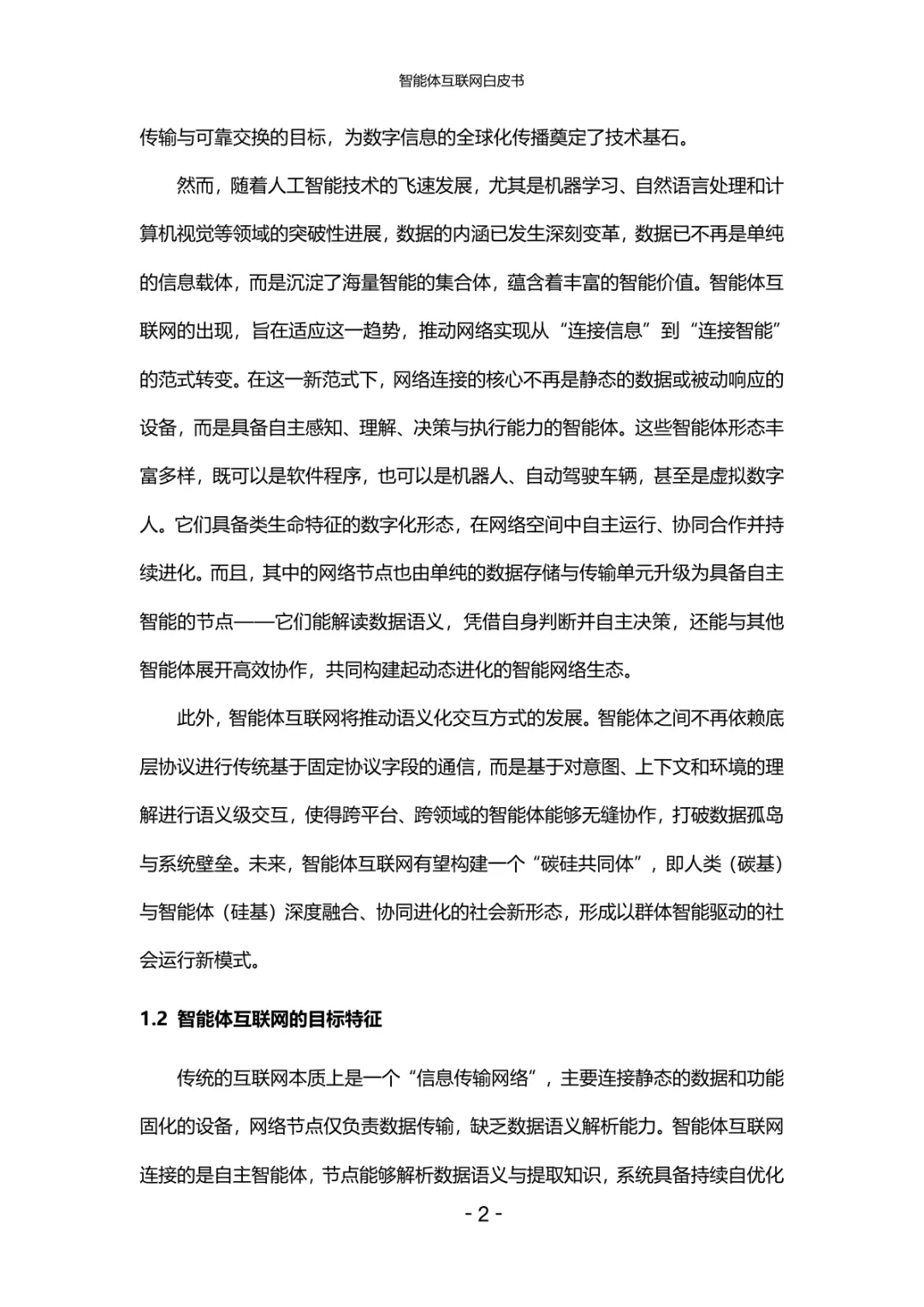 转型背景:生成式AI与大模型突破推动智能体(AI Agent)爆发,传统互联网“连接信息”范式难以满足智能体自主协作、语义理解等新需求,智能体互联网应运而生。 核心特征:具备自主性(智能体自主决策)、语义化(意图级交互)、群体智能(多智能体协同)三大核心特征,实现从“连接设备”到“连接智能”的跃迁。 核心目标:构建支撑智能交互、群体协同与价值共创的基础设施,推动数字与物理世界深度融合,形成“碳硅共同体”(人类与智能体协同进化)的社会新形态。