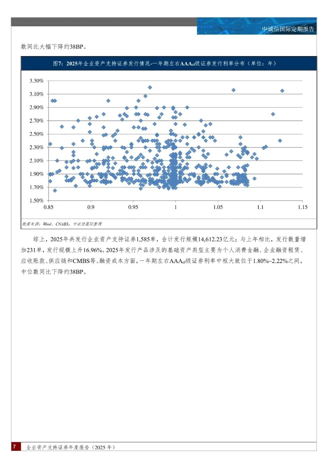 发行情况:2025 年全年,企业资产支持证券发行 1,585 单,合计发行规模 14,612.23亿元;与上年相比,发行数量增加 231 单,发行规模上升 16.96%。发行产品涉及的基础资产类型主要为个人消费金融、企业融资租赁、应收账款、供应链和 CMBS 等。成本方面,一年期左右 AAAsf 级证券利率中枢大致位于 1.80%~2.22%之间,中位数同比下降约 38BP;