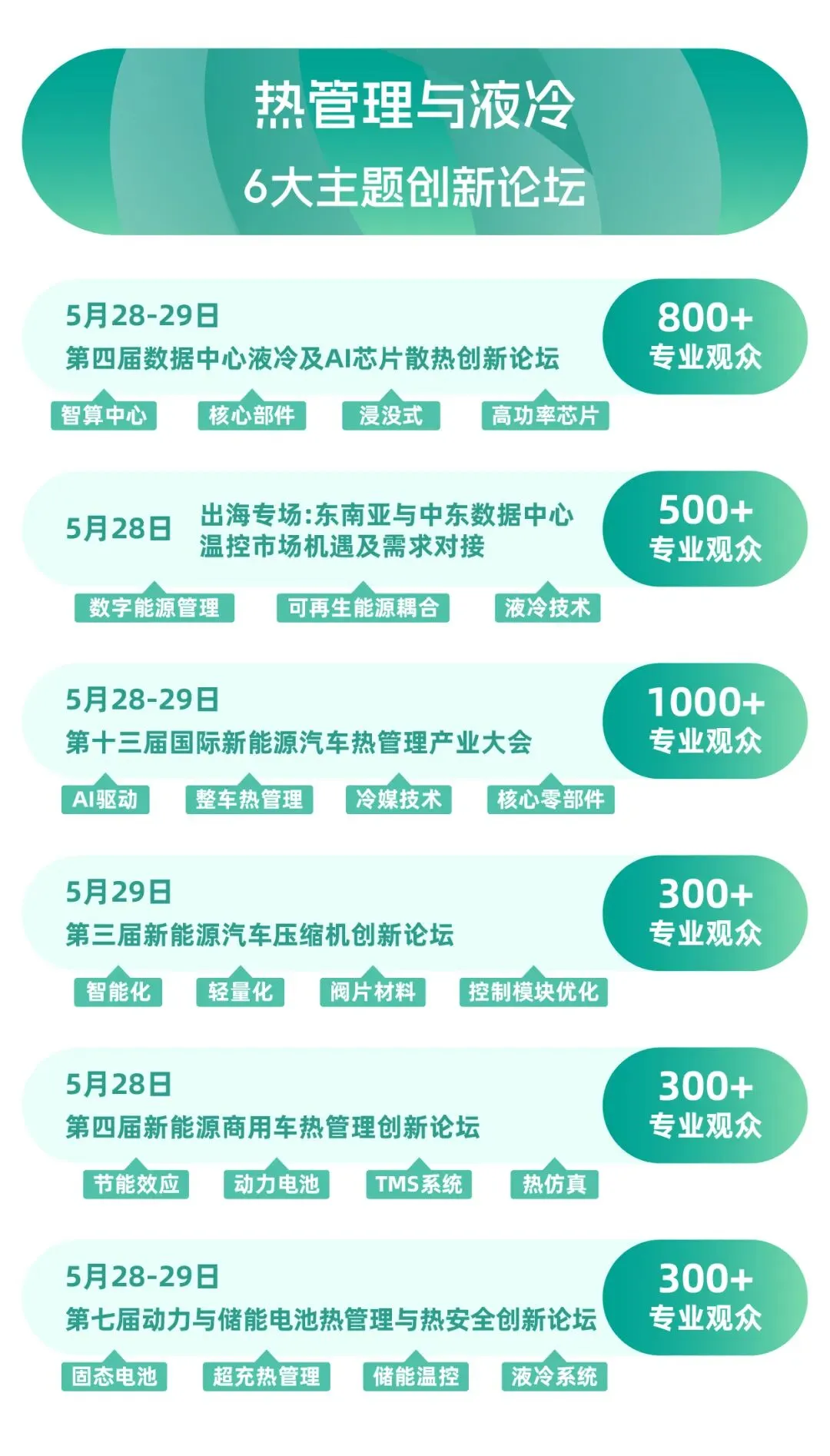 以上《全液冷冷板系统参考设计及验证白皮书》系统梳理了数据中心液冷行业背景、技术优化、系统架构、关键部件设计及未来展望,为数据中心液冷领域的技术落地、设计优化提供全面支撑。为进一步汇聚行业力量,探讨液冷技术及冷却液的前沿趋势、推动产业链上下游供需精准对接,以下附上EAC2026热管理与液冷产业展览会6大主题创新论坛议程,供行业同仁参考交流、共探发展。EAC2026热管理与液冷产业展览会详细议程可查看既往发布的《【限时免费】EAC数据中心液冷及芯片散热论坛议程首发:大咖共探全球温控技术突围新范式》。