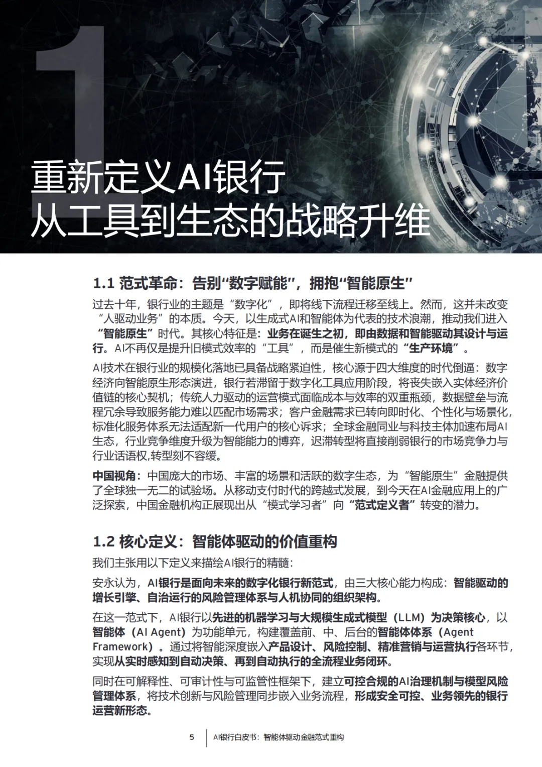 AI银行不仅是“工具”,而是“生态”AI银行的核心是从“人驱动流程”转向“智能体协同驱动流程”,以AI为基本单元重构业务体系,实现“智能驱动的增长引擎+自主运行的风险体系+人机协同的组织范式”。