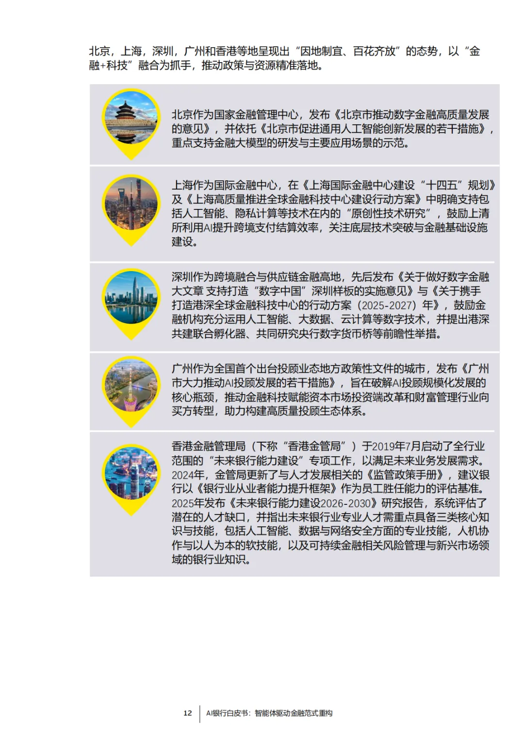 中国路径:稳妥有序、场景驱动中国在政策引导下(如“人工智能+”行动、金融科技发展规划),以丰富的实体经济场景为试验场,推动AI在银行业的快速规模化落地,形成“国有大行平台化、股份行旅程化、区域行深耕化”的分层创新格局。