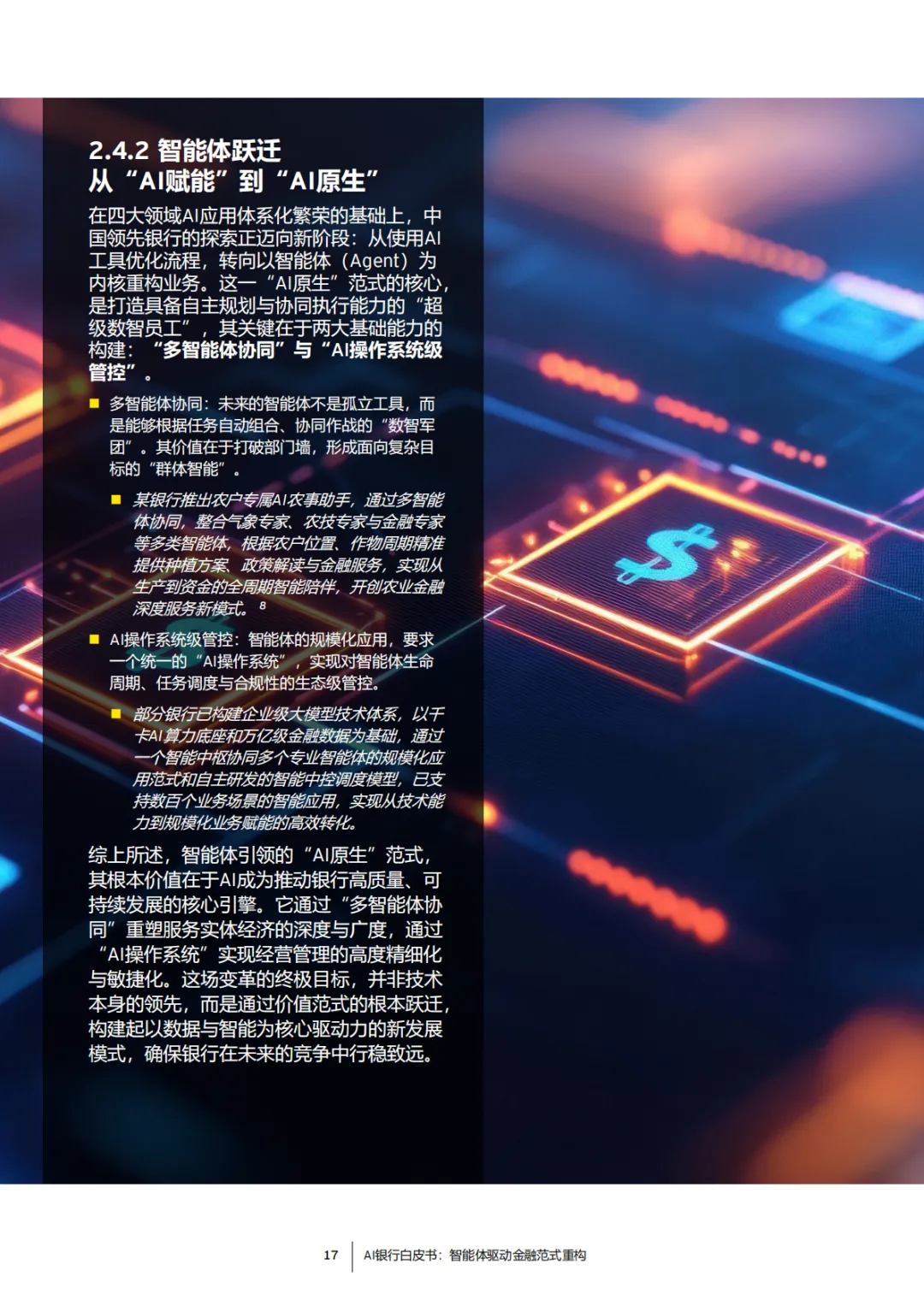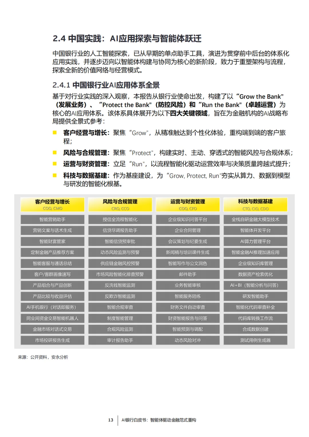 中国实践:已在客户经营、风险合规、运营财资、科技基建四大领域形成体系化应用,并逐步向“多智能体协同”跃迁。