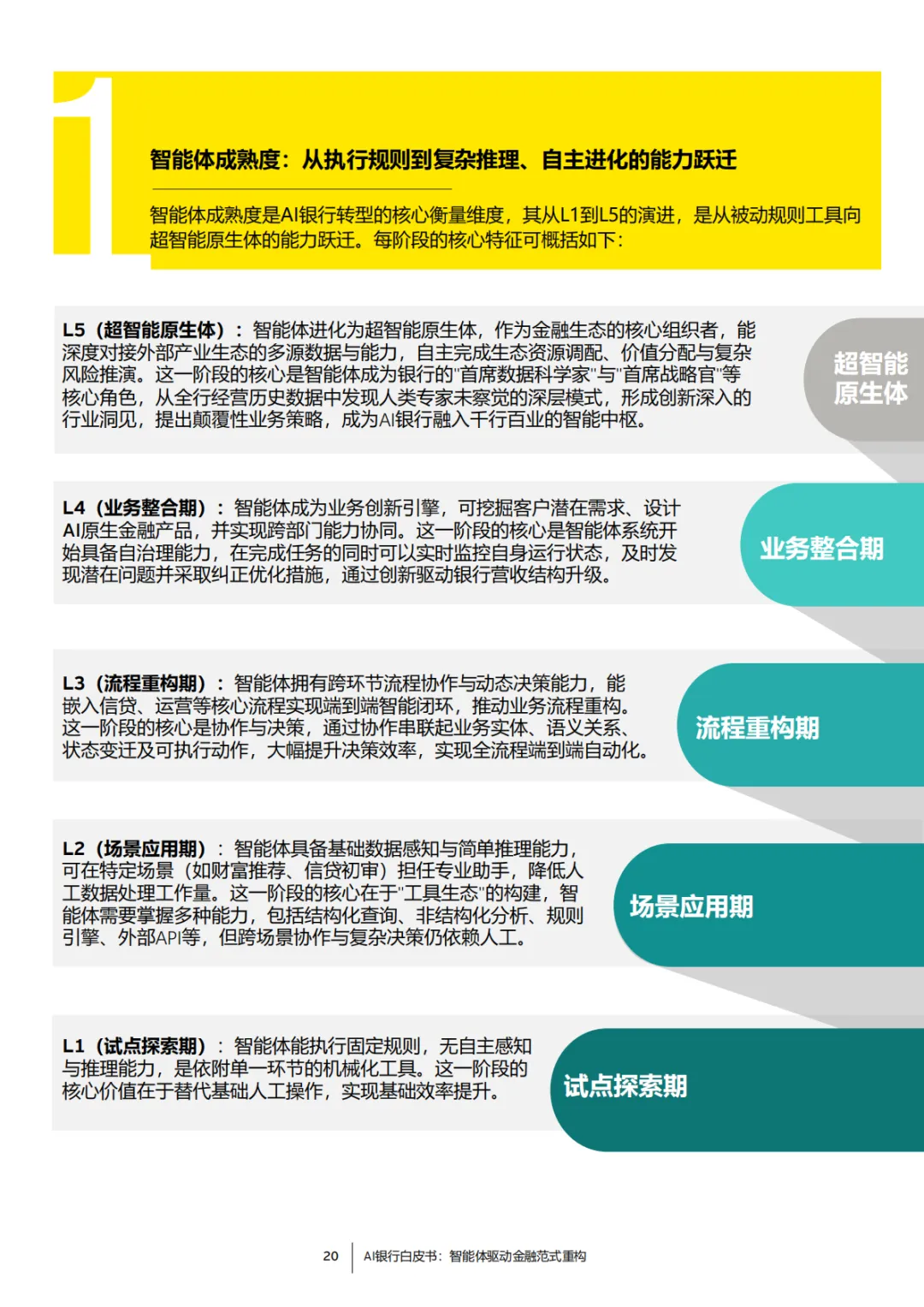 成熟度评估:五阶演进模型安永提出从L1试点探索到L5超智能原生体的五阶段成熟度模型,涵盖智能体、数据与模型、组织与人才、技术架构、价值与治理五大维度,帮助银行定位自身并规划路径。