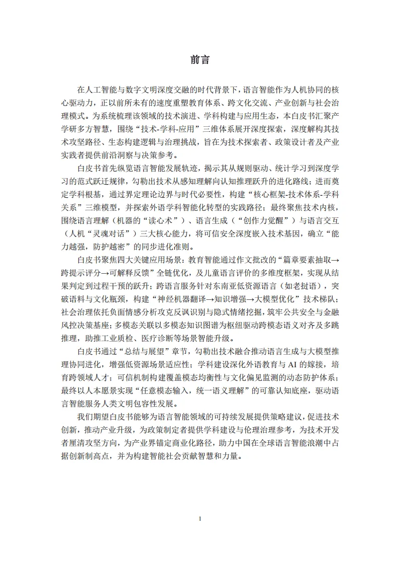 《中国人工智能学会系列白皮书——语言智能》系统梳理了语言智能领域的技术演进、学科构建与应用生态,围绕“技术-学科-应用”三维体系展开深度探索,为行业发展提供了全景式参照。