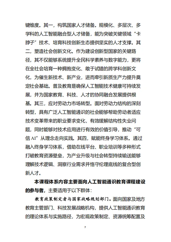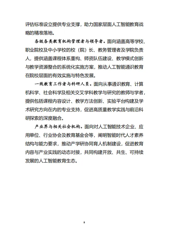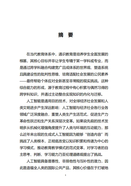 本白皮书不仅是一份课程体系设计指南,更是中国在智能时代推动教育系统性变革、培育未来公民人工智能素养、确保技术发展真正服务于人类福祉的重要战略思考。它为构建“全球共识+本土实践”的人工智能通识教育生态提供了清晰的理论框架与实践路径。
