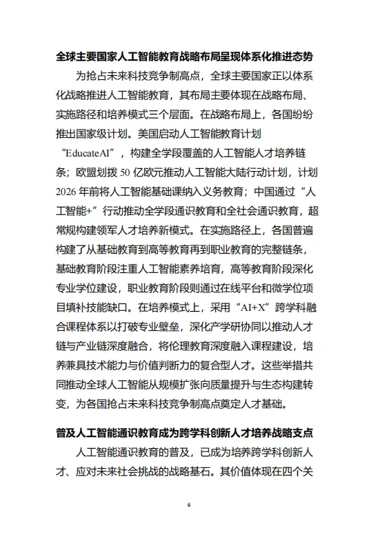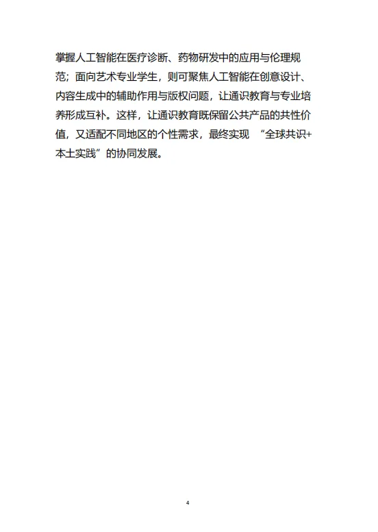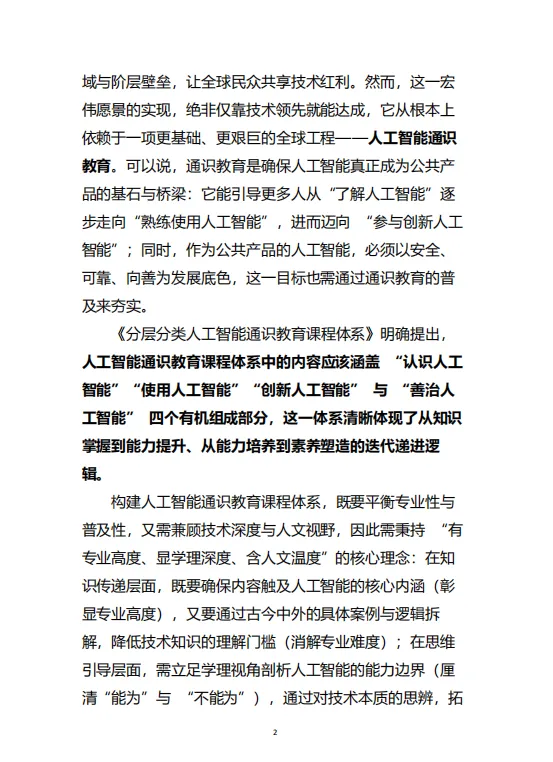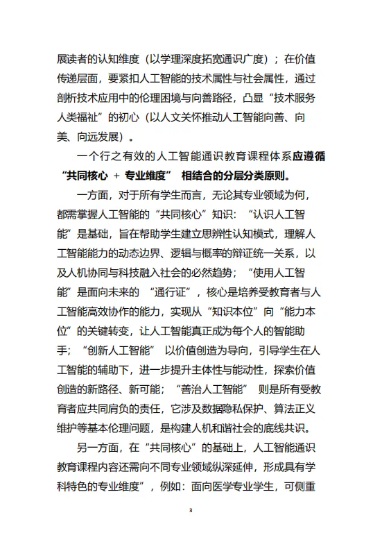 白皮书强调,所有学生均应掌握人工智能的“共同核心”知识,包括基础认知、工具使用、创新意识与伦理共识。在此基础上,针对理工农医、人文社科、艺术等不同专业背景,设计具有学科特色的“专业维度”内容,实现通识教育的普惠性与专业适配性的统一。