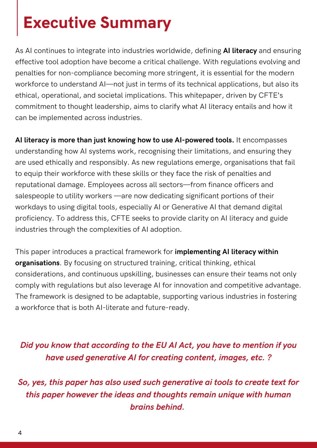 这份《AI Literacy Whitepaper》(AI素养白皮书)由CFTE(金融、科技与创业中心)与AIFA(金融AI学院)联合发布,以“定义AI素养—构建实施框架—推动组织转型”为核心逻辑,系统回应了“AI时代 workforce 如何适应技术变革”的关键问题。以下从核心逻辑、框架创新、实践价值、未来方向四个维度展开深度解读: