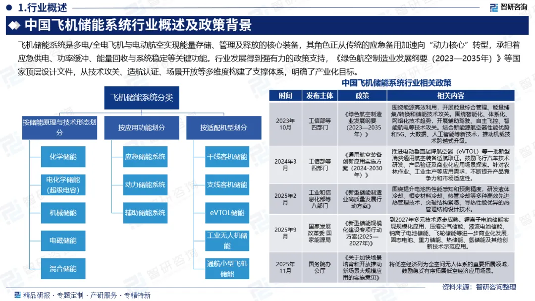 飞机储能系统作为多电/全电飞机与电动航空的核心装备,集储能介质、功率转换、控制管理与安全防护于一体,可实现能量高效存储与按需释放,支撑推进、航电等关键负载运行。我国高度重视其发展,出台多项政策从技术研发补贴、适航认证等多维度提供支撑,明确核心技术攻关方向与产业化目标,为突破适航壁垒、加速商业化落地奠定基础。行业产业链上中下游紧密关联,上游聚焦核心设备与材料供应,中游为系统集成与解决方案,下游覆盖多元应用场景,市场需求与技术迭代双向驱动。当下,低空经济作为国家战略性新兴产业快速发展,为飞机储能系统带来持续扩容的需求空间与技术迭代动力。当前行业加速转型,市场格局呈现化学储能主导、多元技术补充的特征,固态与氢燃料电池成关键技术方向,技术多元布局持续推进。受益于多重利好,市场规模高速增长,预计2030年突破300亿元。未来,行业将呈现技术、产业链、场景三大核心发展趋势,实现多元升级。