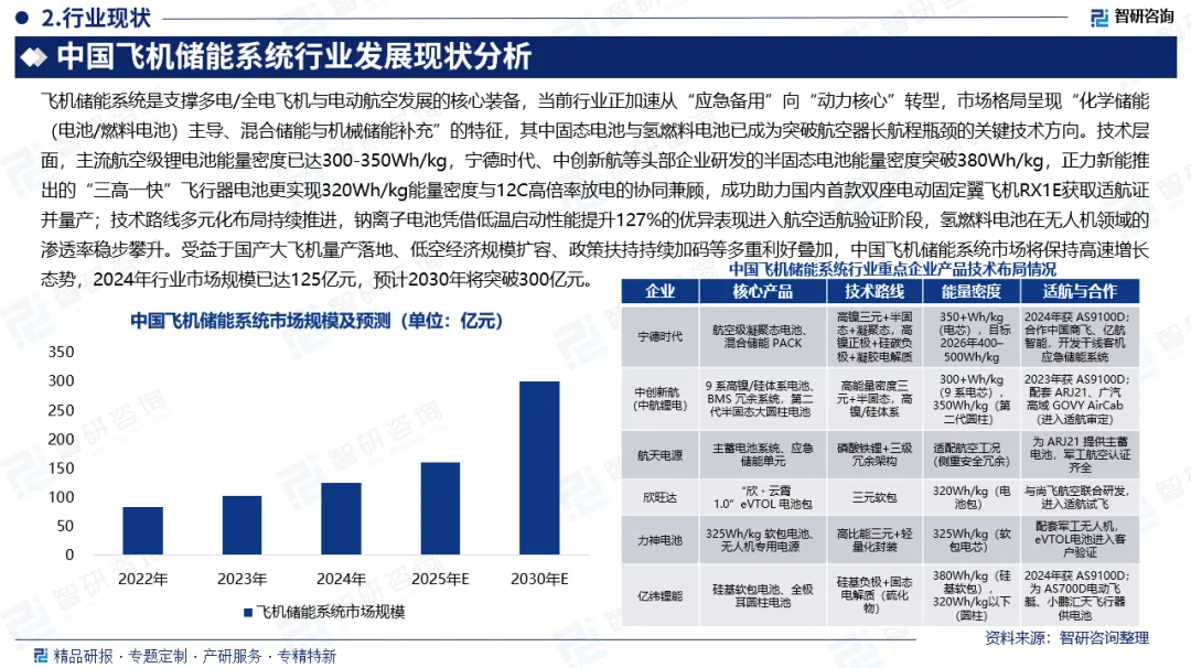 飞机储能系统是支撑多电/全电飞机与电动航空发展的核心装备,当前行业正加速从“应急备用”向“动力核心”转型,市场格局呈现“化学储能(电池/燃料电池)主导、混合储能与机械储能补充”的特征,其中固态电池与氢燃料电池已成为突破航空器长航程瓶颈的关键技术方向。技术层面,主流航空级锂电池能量密度已达300-350Wh/kg,宁德时代、中创新航等头部企业研发的半固态电池能量密度突破380Wh/kg,正力新能推出的“三高一快”飞行器电池更实现320Wh/kg能量密度与12C高倍率放电的协同兼顾,成功助力国内首款双座电动固定翼飞机RX1E获取适航证并量产;技术路线多元化布局持续推进,钠离子电池凭借低温启动性能提升127%的优异表现进入航空适航验证阶段,氢燃料电池在无人机领域的渗透率稳步攀升。受益于国产大飞机量产落地、低空经济规模扩容、政策扶持持续加码等多重利好叠加,中国飞机储能系统市场将保持高速增长态势,2024年行业市场规模已达125亿元,预计2030年将突破300亿元。