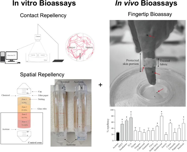 在空间测定中,百里香和肉桂是测试中活性最高的化合物,在暴露后15分钟内分别能驱避100% 和80% 的蜱虫,在相同浓度下,其效力约为DEET(避蚊胺(N,N-二乙基-3-甲基苯甲酰胺))的2倍。