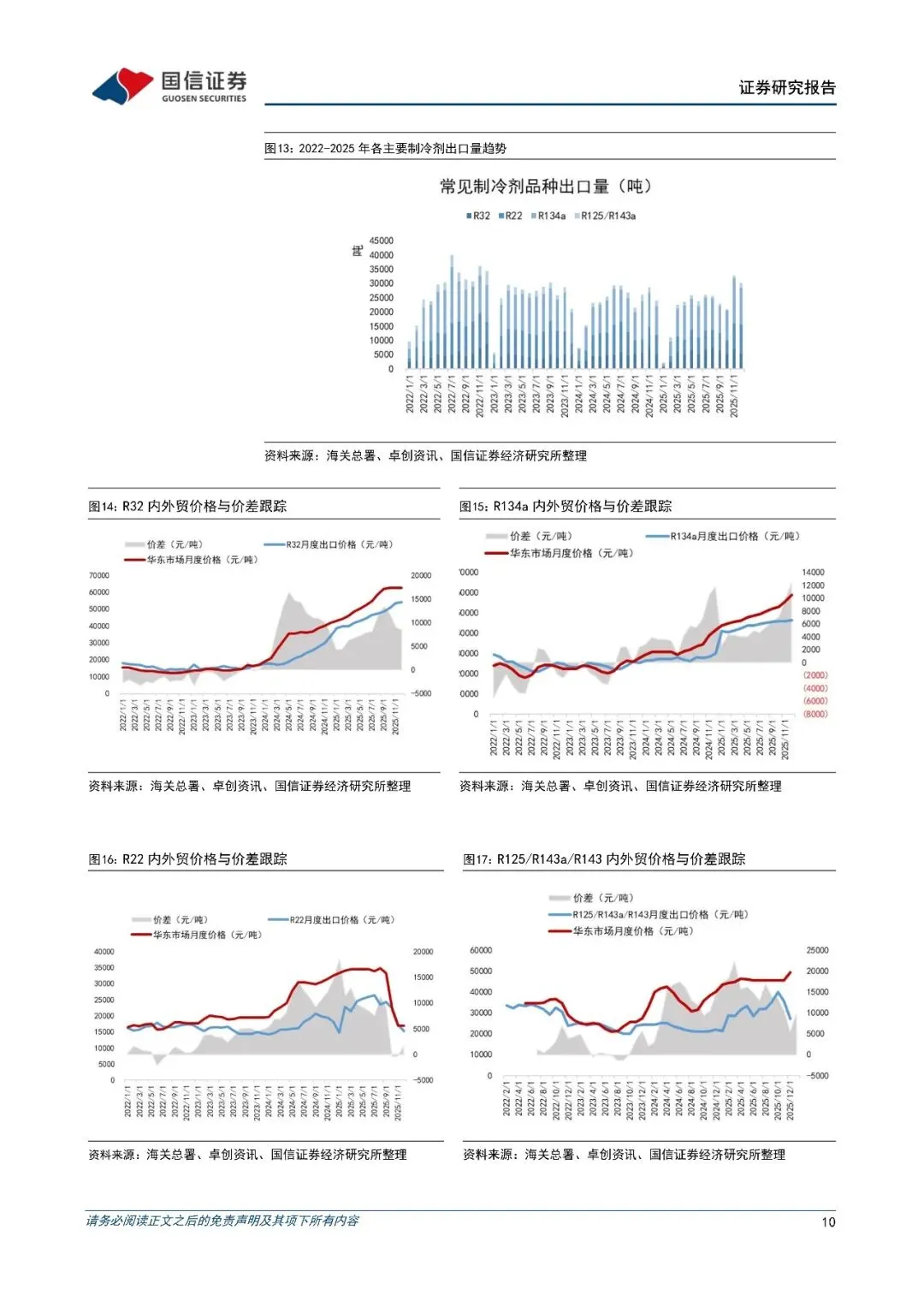 一季度主流制冷剂长协价格持续上涨。展望一季度,伴随一季度长协价格确定,终端空调企业长协订单执行稳定:据卓创资讯,R32长协价格将在6.12万元/吨,环比2025年四季度价格上涨1000元/吨,涨富1.66%;R410A长协价格在5.51万元/吨,环比2025年四季度上涨1900元/吨5,涨幅3.57%预计往后一周R32价格区间约6.2-6.3万元/吨,R410a往后-一周价格区间约5.5-5.6万元/吨,R134a往后一周价格区间约5.6-5.7万元/吨
