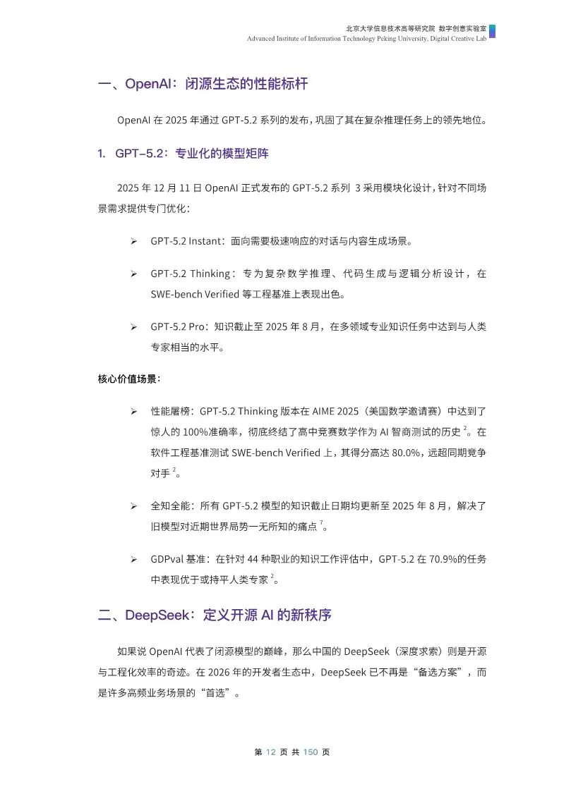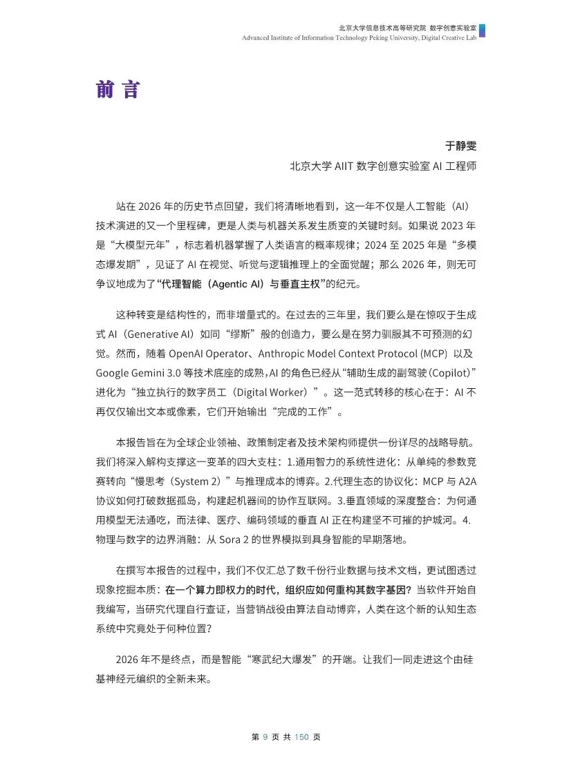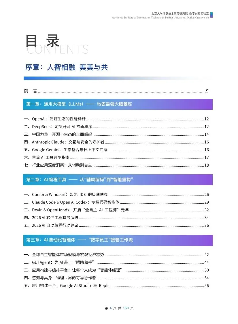 这份报告由北京大学信息技术高等研究院数字创意实验室编制,共150页,定位为"AI工具全景指南"。报告以"美美与共"为核心理念,探讨在算力狂飙的时代,人类如何通过AI工具保持创造力主体性,实现人机共生。一、2026年的关键转折:从"辅助生成"到"代理智能"报告将2026年定义为"代理智能(Agentic AI)与垂直主权"的纪元。AI的角色已从"辅助生成的副驾驶(Copilot)"进化为"独立执行的数字员工(Digital Worker)"。这一转变的核心在于:AI不再仅仅输出文本或像素,而是开始输出"完成的工作"。支撑这一变革的四大支柱包括:- 通用智力的系统性进化(从参数竞赛转向"慢思考"与推理成本的博弈)- 代理生态的协议化(MCP与A2A协议打破数据孤岛)报告深入分析了全球主要大模型厂商的技术路线与竞争格局:OpenAI:通过GPT-5.2系列巩固闭源生态的性能标杆地位,采用模块化设计(Instant/Thinking/Pro),在复杂数学推理和代码生成上表现卓越。DeepSeek:定义开源AI的新秩序。R1首次证明纯强化学习可诱导出强大逻辑推理能力;V3.2标志着"原生推理"时代的到来,通过双模式切换(Thinking/Non-Thinking)打破聊天模型与推理模型的界限,且以极致性价比(API成本为西方顶级模型的几分之一)成为高频工程化调用的首选。中国开源力量:Qwen(全球开发者采用度最高的开源大模型系列之一)、GLM(工具调用与中文深度理解)、MiniMax(长文本理解与情感交互)、Doubao(极致性价比与多模态交互)、Hunyuan(微信生态深度整合)等形成全面崛起的态势。Anthropic Claude:以"计算机使用"(Computer Use)能力和安全设计为核心护城河,Claude 4.5 Opus在OSWorld评测中以66.3%的得分大幅领先,成为跨30小时以上长程自主任务的首选。Google Gemini:凭借百万级Token上下文(Gemini 3 Pro支持100万Token)和原生多模态能力,成为处理超长文本、全代码库分析的默认选择。报告提出"混合智能时代的生存法则":单一模型通吃天下的时代已结束,最强大的大脑属于善于组合不同模型的开发者。- 2.0辅助时代(2020-2025):AI基于任务自动补全,但人类主导- 3.0原生/智能体时代(2026起):"意图优先"和"智能体主导",AI成为"智能队友"- Vibe Coding(氛围编程)兴起:开发者通过自然语言描述产品"感觉"与逻辑,而非纠结语法细节- 全球84%的开发者已将AI纳入日常工作流,51%的工程师每天依赖AI进行架构设计、测试生成及部署监控- 工程师角色从"Writer"转变为"Reviewer",从"打字员"进化为"任务编排家"- AI原生IDE(Cursor、Windsurf):提升人机协作效率,Cursor强调"显式指定"的精确控制,Windsurf首创"Cascade"流技术实现"隐式感知"- 专精型代码智能体(Claude Code、OpenAI Codex):处理高复杂度任务,具备深度规划能力- 全自主软件工程师(Devin、OpenHands):端到端交付独立任务Devin在Nubank ETL迁移案例中展现出惊人效能:将原本需要1000多名工程师18个月的任务,在数周内完成,实现8-12倍工程小时节省和20倍成本节省。报告反复强调一个深层命题:在算力即权力的时代,人类的位置在哪里?答案指向"美美与共"的哲学——技术并非替代人类,而是释放人类:- 人类回归到"定义问题"和"审美判断"的价值高地- 从"怎么做"(How)的泥沼中抽身,回归到"做什么"(What)与"为什么"(Why)报告警示需防范"创意茧房"等潜在风险,坚守中华文化主体性,让技术始终服务于文化繁荣与人类全面发展的终极目标。- 全球企业级LLM市场:2024年约67亿美元 → 2026年约88亿美元 → 2034年预计711亿美元(CAGR 26.1%)- 全球IT支出:2026年预计6.084万亿美元(同比增长9.8%),首次跨越六万亿美元里程碑- AI应用软件:2026年预计2697亿美元(增长57.0%)- AI基础设施软件:2026年预计2298亿美元(增长83.0%)- 约63%的企业倾向于私有或封闭部署LLM以规避数据泄露风险这份报告不仅是一份技术指南,更是一份关于如何在数字洪流中保持创造力主体性的宣言。它以"技术社会整体论"的视野,记录了AI赋能文化创意的实践轨迹,探寻数智文明时代"美美与共"的全新可能——以工具为舟,以人文为帆,共同驶向人机共生的新未来。部分内容预览