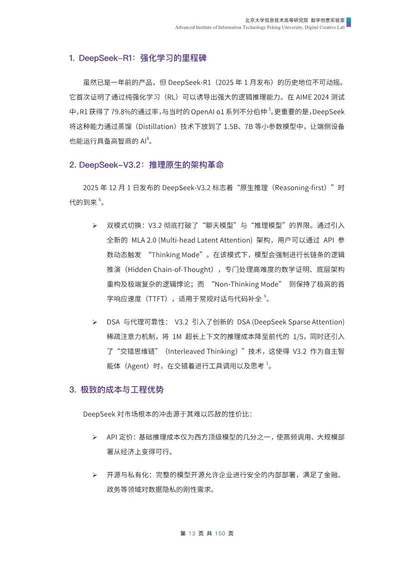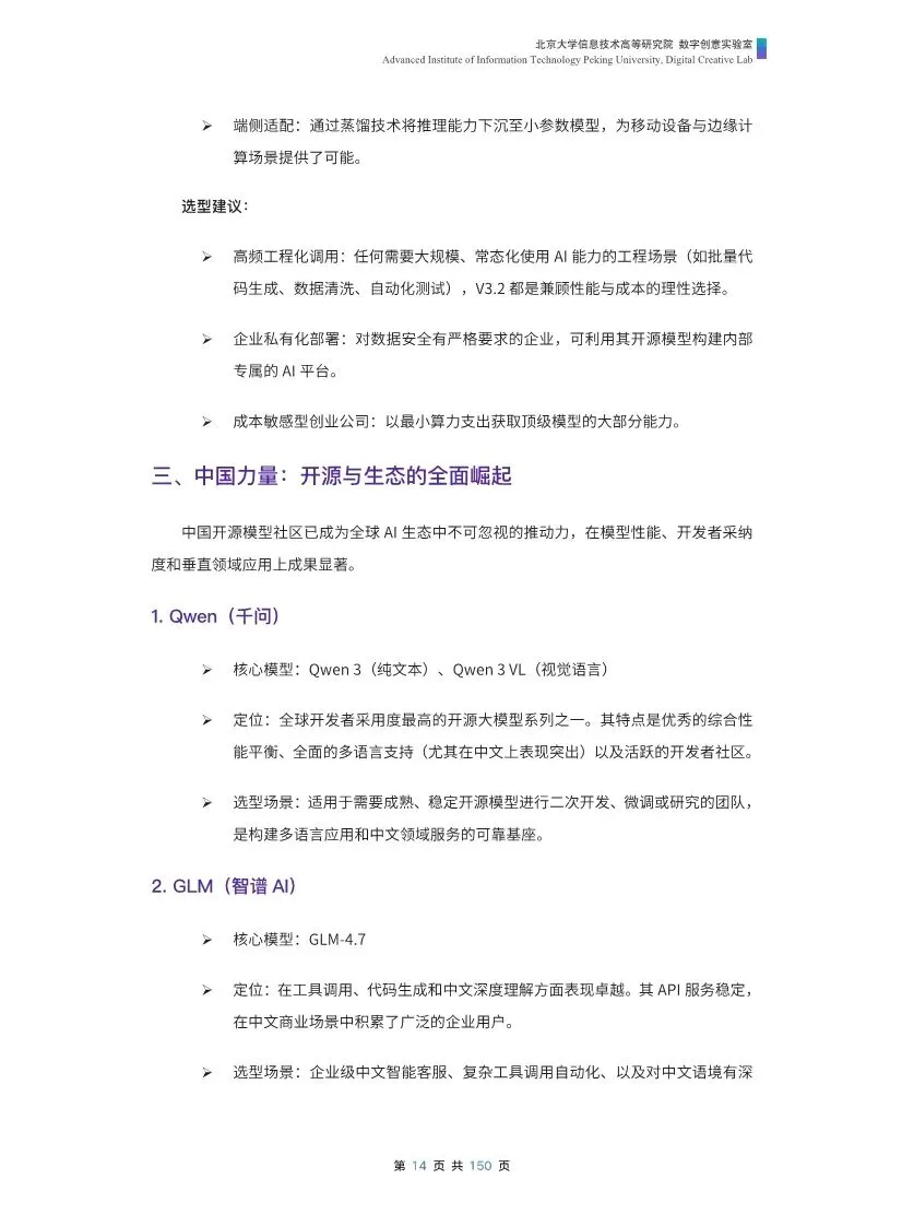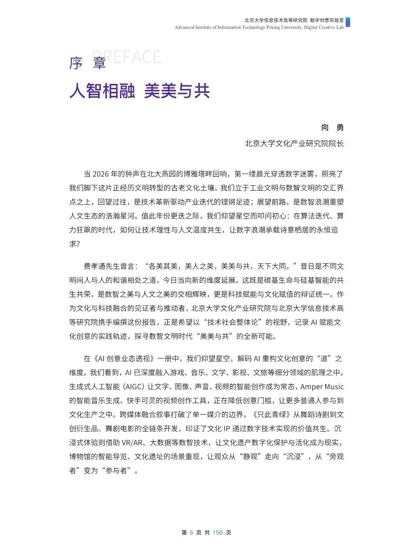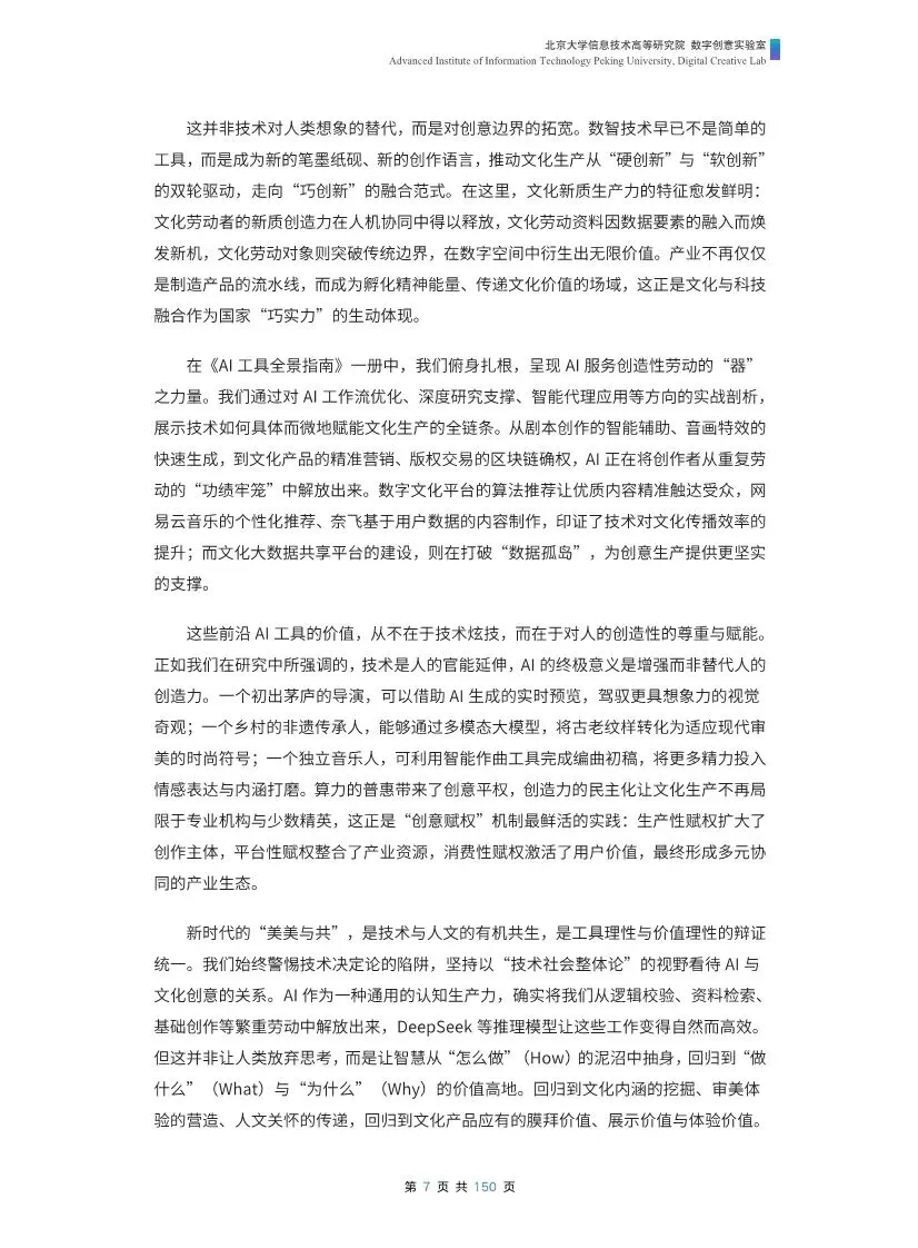 这份报告由北京大学信息技术高等研究院数字创意实验室编制,共150页,定位为"AI工具全景指南"。报告以"美美与共"为核心理念,探讨在算力狂飙的时代,人类如何通过AI工具保持创造力主体性,实现人机共生。一、2026年的关键转折:从"辅助生成"到"代理智能"报告将2026年定义为"代理智能(Agentic AI)与垂直主权"的纪元。AI的角色已从"辅助生成的副驾驶(Copilot)"进化为"独立执行的数字员工(Digital Worker)"。这一转变的核心在于:AI不再仅仅输出文本或像素,而是开始输出"完成的工作"。支撑这一变革的四大支柱包括:- 通用智力的系统性进化(从参数竞赛转向"慢思考"与推理成本的博弈)- 代理生态的协议化(MCP与A2A协议打破数据孤岛)报告深入分析了全球主要大模型厂商的技术路线与竞争格局:OpenAI:通过GPT-5.2系列巩固闭源生态的性能标杆地位,采用模块化设计(Instant/Thinking/Pro),在复杂数学推理和代码生成上表现卓越。DeepSeek:定义开源AI的新秩序。R1首次证明纯强化学习可诱导出强大逻辑推理能力;V3.2标志着"原生推理"时代的到来,通过双模式切换(Thinking/Non-Thinking)打破聊天模型与推理模型的界限,且以极致性价比(API成本为西方顶级模型的几分之一)成为高频工程化调用的首选。中国开源力量:Qwen(全球开发者采用度最高的开源大模型系列之一)、GLM(工具调用与中文深度理解)、MiniMax(长文本理解与情感交互)、Doubao(极致性价比与多模态交互)、Hunyuan(微信生态深度整合)等形成全面崛起的态势。Anthropic Claude:以"计算机使用"(Computer Use)能力和安全设计为核心护城河,Claude 4.5 Opus在OSWorld评测中以66.3%的得分大幅领先,成为跨30小时以上长程自主任务的首选。Google Gemini:凭借百万级Token上下文(Gemini 3 Pro支持100万Token)和原生多模态能力,成为处理超长文本、全代码库分析的默认选择。报告提出"混合智能时代的生存法则":单一模型通吃天下的时代已结束,最强大的大脑属于善于组合不同模型的开发者。- 2.0辅助时代(2020-2025):AI基于任务自动补全,但人类主导- 3.0原生/智能体时代(2026起):"意图优先"和"智能体主导",AI成为"智能队友"- Vibe Coding(氛围编程)兴起:开发者通过自然语言描述产品"感觉"与逻辑,而非纠结语法细节- 全球84%的开发者已将AI纳入日常工作流,51%的工程师每天依赖AI进行架构设计、测试生成及部署监控- 工程师角色从"Writer"转变为"Reviewer",从"打字员"进化为"任务编排家"- AI原生IDE(Cursor、Windsurf):提升人机协作效率,Cursor强调"显式指定"的精确控制,Windsurf首创"Cascade"流技术实现"隐式感知"- 专精型代码智能体(Claude Code、OpenAI Codex):处理高复杂度任务,具备深度规划能力- 全自主软件工程师(Devin、OpenHands):端到端交付独立任务Devin在Nubank ETL迁移案例中展现出惊人效能:将原本需要1000多名工程师18个月的任务,在数周内完成,实现8-12倍工程小时节省和20倍成本节省。报告反复强调一个深层命题:在算力即权力的时代,人类的位置在哪里?答案指向"美美与共"的哲学——技术并非替代人类,而是释放人类:- 人类回归到"定义问题"和"审美判断"的价值高地- 从"怎么做"(How)的泥沼中抽身,回归到"做什么"(What)与"为什么"(Why)报告警示需防范"创意茧房"等潜在风险,坚守中华文化主体性,让技术始终服务于文化繁荣与人类全面发展的终极目标。- 全球企业级LLM市场:2024年约67亿美元 → 2026年约88亿美元 → 2034年预计711亿美元(CAGR 26.1%)- 全球IT支出:2026年预计6.084万亿美元(同比增长9.8%),首次跨越六万亿美元里程碑- AI应用软件:2026年预计2697亿美元(增长57.0%)- AI基础设施软件:2026年预计2298亿美元(增长83.0%)- 约63%的企业倾向于私有或封闭部署LLM以规避数据泄露风险这份报告不仅是一份技术指南,更是一份关于如何在数字洪流中保持创造力主体性的宣言。它以"技术社会整体论"的视野,记录了AI赋能文化创意的实践轨迹,探寻数智文明时代"美美与共"的全新可能——以工具为舟,以人文为帆,共同驶向人机共生的新未来。部分内容预览