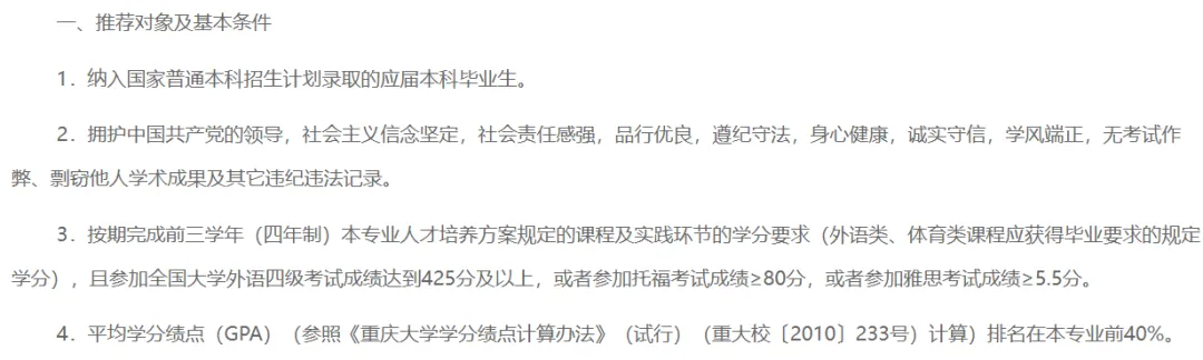 且参加全国大学外语四级考试成绩达到425分及以上,或者参加托福考试成绩≥80分,或者参加雅思考试成绩≥5.5分。而平均学分绩点(GPA)排名在本专业前40%。