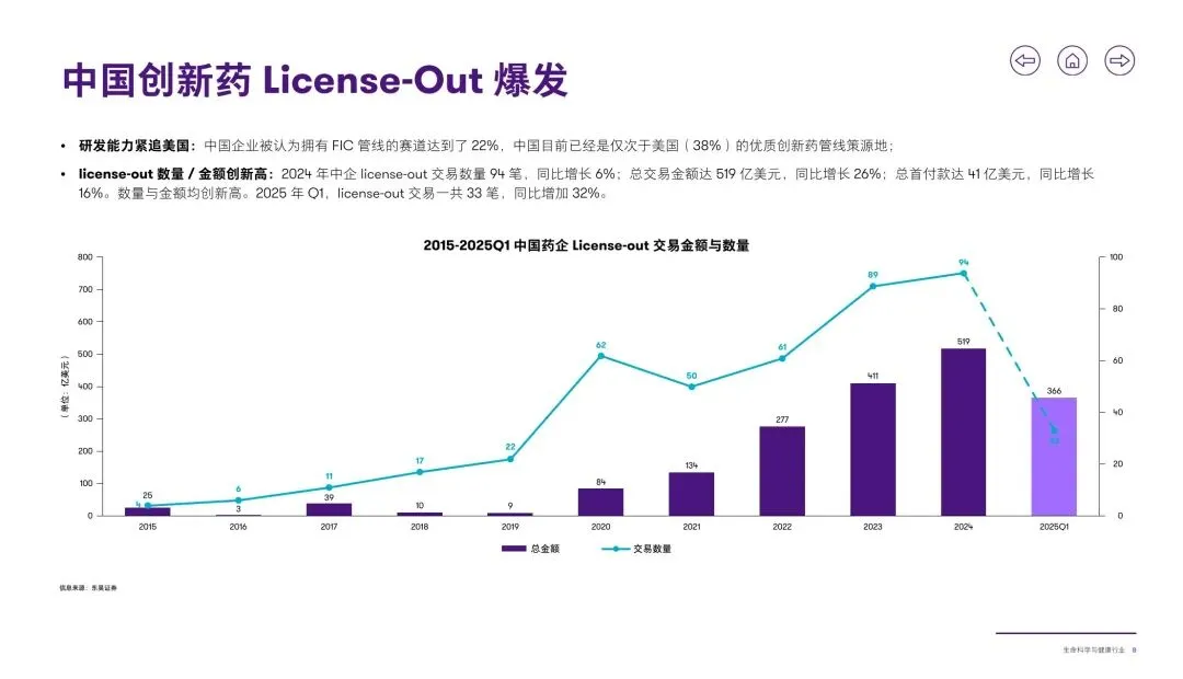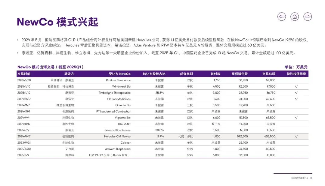 :中国创新药 License-out 交易持续爆发,2024 年交易 94 笔、金额 519 亿美元,2025Q1 交易 33 笔同比增 32%,美国为主要受让地区(占比 55%)。出海模式从单纯产品授权向 “股权绑定” 升级,NewCo 模式兴起,截至 2025Q1 完成 13 起交易,恒瑞、康诺亚等企业通过保留 NewCo 股权(最高 30%),分享长期收益并隔离地缘风险,实现从 “卖青苗” 到联合开发的转型。