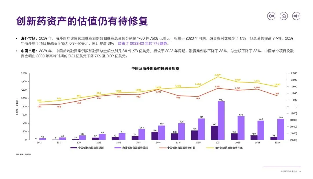 :海外医疗健康融资 2024 年回暖(金额增 9%),但国内市场仍处调整期,2024 年融资案例数、金额分别下降 38%、33%,单个项目融资额降至 0.09 亿美元。资本市场呈现 “港股回暖 + 科创板改革” 双趋势,港股 18A 融资额同比增 35%,科创板第五套标准扩大适用范围,支持未盈利硬科技企业上市,AI + 医疗、商业航天等领域企业受益。