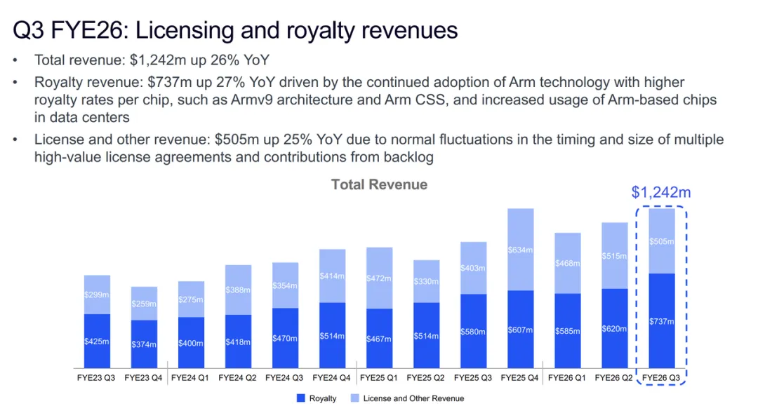 Arm总营收达12.42亿美元,同比增长26%,增长动力主要来自特许权使用费与授权业务的协同发力。