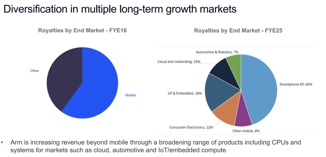 Arm 的核心板块之前还是“手机 CPU 架构”,移动端仍然重要,但不再是唯一支柱,很重要的变化Arm的收入结构正在快速去“单一化”。