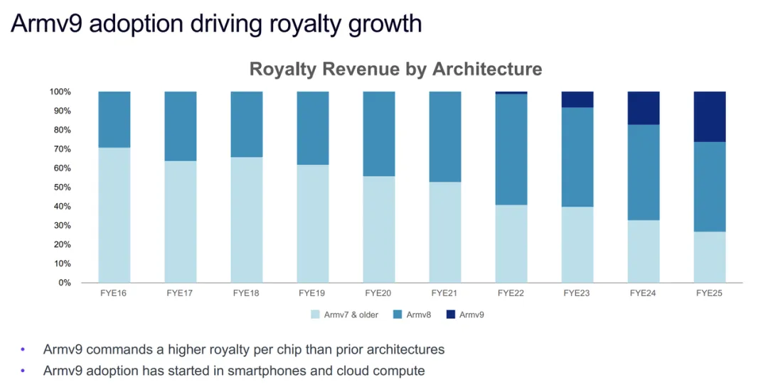 如果说数据中心是增量市场,那 Armv9 架构,就是Arm“单芯片价值抬升”的核心抓手,Armv9 的特许权使用费,是明显高于 Armv8 的。