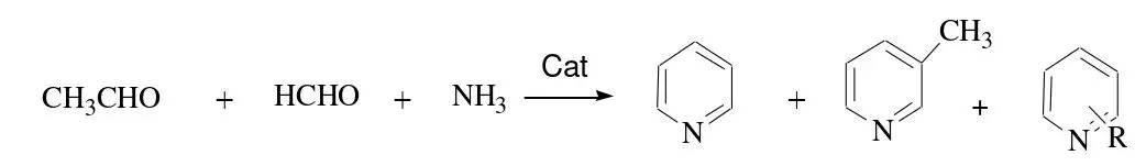 该方法原料易得,易规模化生产,但该工艺最核心的在于其催化剂的开发和研制。20世纪50年代,吡啶碱产率只有40%~50%,催化剂最开始使用非晶形的硅铝酸盐,但其缺点明显,孔结构不规整,易积碳,选择性较差,且容易失活、寿命较短,成本高。之后使用晶型(择形)的硅铝酸盐用于改善积碳,尤其以ZSM-5型沸石分子筛使用最广泛,其独特的微孔道结构,让改性后的催化剂,吡啶碱合成产率提高到50%~65%。近些年在吡啶碱合成机理研究中,亚胺机理研究表明,吡啶和3-甲基吡啶的产率主要与催化剂中的B酸中心和L酸中心有关,而通过在分子筛中,利用一些贵金属负载改性,如Pt、Pd或Rh等,可以提高催化剂的活性,吡啶碱工业化产率达到70%~80%。