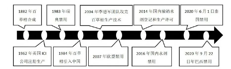 吡啶碱在2023年行业总产值达到数十亿元人民币,同比增长显著。这一增长主要得益于国家政策的支持及市场需求的扩大以及技术创新的持续推进。农药是吡啶最大的消费领域,其中作为世界第二大除草剂百草枯(Paraquat)是消耗吡啶最大的单品,占据了吡啶70%的消费市场。百草枯最早是由卜内门公司(LCL,现为先正达)开发,于1962年开始上市,其优秀的除草效果让其一度成为第二大除草剂,畅销于120多个国家,但因其毒性,被20多个国家禁止或限制使用。其发展史如图1所示。